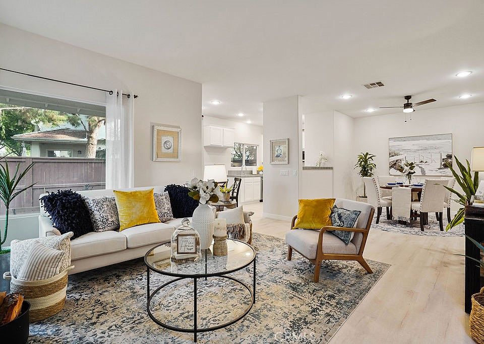 Renovated Rancho Park townhouse located in a gated community offering both security and privacy. Situated on a corner with only one common wall, this home features a first level with a living room and fireplace, dining room, kitchen, a downstairs bedroom with bath, and a laundry room. The renovated kitchen includes new appliances and a breakfast nook. On the second level, the primary bedroom offers an en suite bathroom with a separate shower, tub, dual vanities, and a vanity counter. Two additional well-sized bedrooms and a hall bath with dual vanities complete the upstairs. The home offers views of the greenbelt from the primary bedroom and pool & spa views from the two upstairs bedrooms. Natural light fills the space, creating a peaceful atmosphere. Other features include brand new luxury vinyl and carpet flooring, new interior paint (including the garage), recessed lighting, and more. Conveniently located near major employment centers, Ontario International Airport, and shopping centers like Ontario Mills and Victoria Gardens Outdoor Mall. Come see it today!