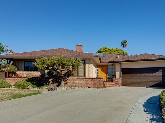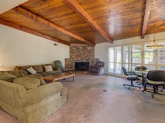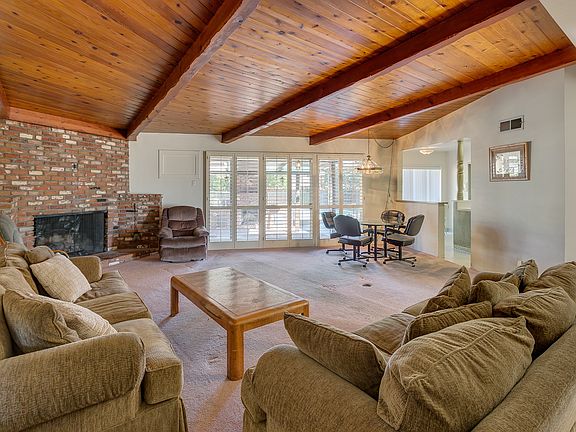Situated on an expansive lot, home features four bedrooms, two bathrooms & a beautiful backyard perfect for entertaining. Separate family room with stone fireplace and plantation shutters can also be used as a den. Spacious living room features brick fireplace, exposed wood beamed ceilings & dining area. Sliding glass door with plantation shutters overlooks the backyard. Eat-in kitchen provides breakfast nook, breakfast bar and sliding glass door leading to backyard. Laundry room next to kitchen with sink & plenty of storage space. Mother-in-law suite off the laundry room with attached bathroom offers privacy. Master bedroom features plantation shutters, master bathroom with vanity, and views of backyard & pool. Additional bedrooms include plantation shutters & closets with ample storage space. Backyard has a gated pool, spa, built-in brick fireplace, and plenty of space for a dog run & garden. Additional amenities include central air-conditioning.