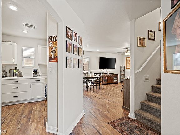 AMAZING location, just outside of Rhodes Ranch Golf Club surrounded by countless restaurants, grocery stores, shopping, hospitals, schools, gyms and even The Durango Casino. BEAUTIFUL 3bd 3bth home shines with gorgeous wood like vinyl flooring matching the ceiling fans through out the home, complemented by the white wood-like blinds and paint. Super clean kitchen features a nice serving counter for the dining/living room and INCLUDES ALL Stainless Steel appliances. Upstairs the Spacious Master comes to life with its large open balcony overlooking the neighborhood and with close up Mountain Views! Walk in Closets in 2/3 rooms, Ceiling fans in all rooms. Separate Laundry room that INCLUDES Premium Washer and Dryer. Very Cozy backyard to relax in with Edison patio string lights overhead and a small garden area. Gas line ran to backyard to connect your BBQ. Large community POOL, PLAYGROUND/PARK only 5 houses away! 2nd Pool, Playground/park only 11 houses away. 24 hour security patrol.