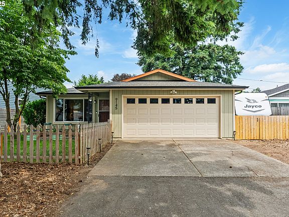Tucked away on a quiet dead-end street in a vibrant, friendly neighborhood, this super charming and well-maintained one-level home offers the best of both worlds—peaceful living just minutes from Mt. Tabor, local shops, cafes, restaurants, and more. With 3 bedrooms, 1 bathroom, and an oversized two-car garage, this home sits on an expansive lot with space to grow, garden, and relax. Step inside to find stylish LVP flooring, LED lighting throughout, and a fully updated kitchen with new cabinetry, counters, appliances, and pantry/bar storage. The bathroom has been tastefully remodeled with a new tub, tile, vanity, and vent fan. The home also features a mini-split system for efficient heating and cooling, updated electrical, a newer sewer line, and an attic with added blown-in insulation. The large backyard is ready for outdoor living with a covered patio, raised garden beds, fenced yard, and a tool shed. There's dedicated RV parking, a wall-mounted garage door opener, and a 50A EV charger already installed. The wood-burning fireplace is newly restored and features a custom mantel. Additional upgrades include new gutters, patio slider, interior solid wood doors, asbestos abatement, and popcorn ceiling removal. This home is move-in ready, full of charm, and positioned for convenience with an easy commute in every direction. [Home Energy Score = 5. HES Report at https://rpt.greenbuildingregistry.com/hes/OR10196097]