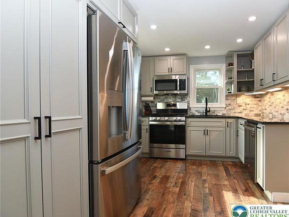 "Move-In" Condition! "Small town" living found in this spacious 3 bedroom, 1.5 bath home nestled in the neighborhood setting of Mountain View. Great curb appeal + charm & character with lots of built-in's & hardwood floors. Fabulous new kitchen equipped with custom "soft closing" cabinetry, stainless steel appliances, 5-burner gas stove, granite counter tops, tile backsplash, built-in pantry, recessed lighting & LVP flooring. Living & Dining Rooms with hardwood floors. Convenient 1st floor bedroom with hardwood floors too. New renovated 1st floor bath with pedestal sink, tub/shower with tile walls & floor. 2nd floor offers two large bedrooms with hardwood floors & updated half bath. Additional living space found in finished basement with recessed lighting & LVP flooring. Over-Sized 1+ detached garage with workshop. Plus a large covered rear porch/patio overlooking a private fenced in yard perfect for all your family barbeques & family gatherings. New HVAC system in 2023. New gas hot water heater in 2023! Replacement windows throughout. The Mountain View Community is centrally located in Hellertown Boro and within walking distance to Morris J. Dimmick Park, Saucon Valley Schools, great restaurants & more. It's a great place to call "HOME"