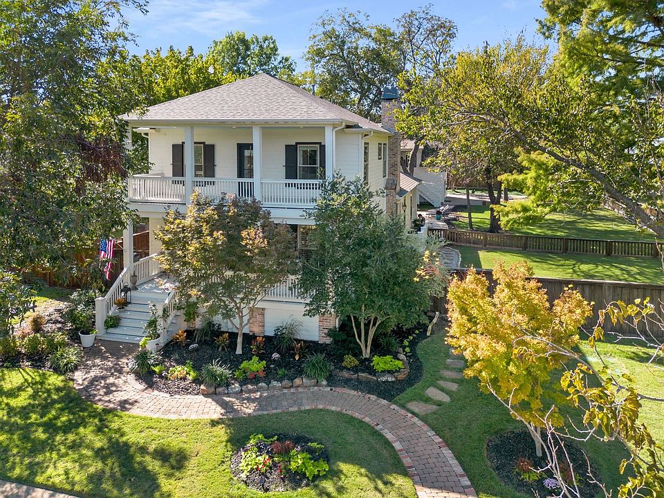 Situated in the heart of McKinney’s beloved Historic District, this exceptional 2013 British Builder home offers the rare opportunity to enjoy modern luxury within a storybook setting on a 0.459-acre double lot. Thoughtfully designed to blend with the area’s timeless architecture, it captures classic McKinney charm while delivering the sophistication and comfort of newer construction. Over 1,250 square feet of covered porches—including a welcoming front porch with a charming bed swing—create inviting spaces to relax and take in the neighborhood’s beauty. Inside, an open-concept floor plan is ideal for entertaining, anchored by a cozy living room with wood-burning fireplace and surround sound. The gourmet kitchen showcases a Thermador Professional gas range with 6-burners, griddle, and dual convection ovens, complemented by a restaurant-style vent hood with heat lamps, built-in refrigerator, apron-front porcelain sink, prep sink, wine refrigerator, pull-out pantry drawers, and reverse osmosis system. A private study with wall of built-ins and a serene downstairs primary suite complete with ensuite bath featuring freestanding tub, frameless shower, and custom walk-in closet. Upstairs are 3 spacious guest bedrooms, one with built-ins and balcony access, full bath with dual sinks and chandelier-adorned walk-in storage closet. Designed for year-round enjoyment, the outdoor living area includes a kitchen with grill and double burner, while the expansive yard shaded by mature pecan, oak, and bald cypress trees still offers space for a pool. The wraparound back porch adds charm and function with a storm shelter, and a wide breezeway connects to the oversized 40’ x 25’ three-car garage. Above the garage, a 560-square-foot guest quarters features a kitchenette, full bath, bedroom with walk-in closet, and walk-out attic. Modern features tankless water heater, 21-SEER HVAC, Energy Star certification and Cat-6 wiring ensure this timeless home lives beautifully in today’s world.