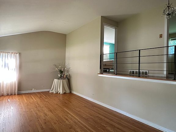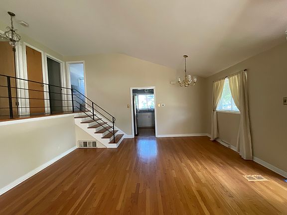 The welcoming entrance level showcases vaulted ceilings that create an airy, open atmosphere. Gleaming hardwood floors flow seamlessly through the living and dining areas, complemented by an updated kitchen with crisp white cabinetry, granite countertops, and stainless steel appliances.