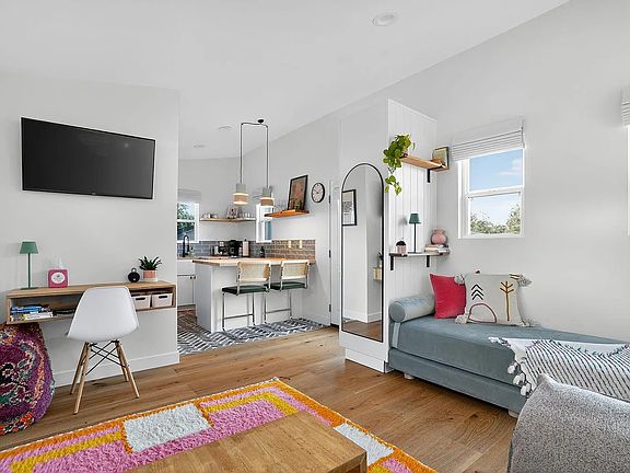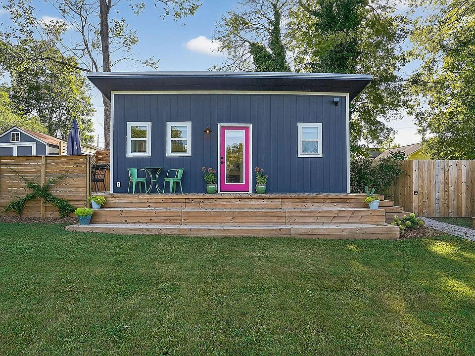 Modern fully furnished tiny house minutes from downtown with view of city skyline. Newly built studio tiny house that can accommodate up to 2 adults. Includes full kitchenette, living room, dedicated work space and full bathroom with shower and washer/dryer combo. Living room has a sofa that pulls out into a comfortable full bed and a separate day bed that converts into a queen. Custom wrap-around deck and outdoor patio/dining area with black stone grill perfect for grilling out in the evenings with a view. Located in the South Park neighborhood, walking distance to downtown Raleigh with restaurants, coffee shops, museums & shopping