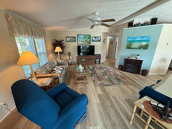 This well-cared for 2-bedroom, 2-bathroom home is being sold furnished. This homile is on a quiet street in the community. As you arrive at the home, you see the large driveway and tasteful landscaping. When you enter the home, you are in the enclosed porch which is an extension of the home. This room has tile floors, a ceiling fan and windows all around providing lots of natural lighting. When you enter the home, you are in the primary living area. This room is perfect for relaxing and watching TV. The dining area has a table with chairs and built-in hutch with a ceiling fan. The kitchen has plenty of cabinets and surface space with a built-in table with chairs. The guest bathroom has a tub with shower. The guest bedroom has 2 twin beds, furniture, a double wall closet and ceiling fan. The primary bedroom is large with a king bed with a new Sterns & Foster mattress (paid $3,000), ceiling fan, and double wall closet. The primary bathroom has been upgraded with tile walk-in shower, an upgraded vanity, and linen closet. There is a large concrete patio behind the garage. UPDATES: Roof (2022), Windows (2023), Vinyl Floors (2023), Front Porch (2023) Only a few minutes to one of the five pools & hot tubs, clubhouse, & fitness center as well as tennis courts, pickleball courts and golf course. This community has a full social calendar and activity schedule. Plenty to keep you busy! This is a 55+ (very active) community. Come join this luxury lifestyle community. YOU WON'T BE DISAPPOINTED!!