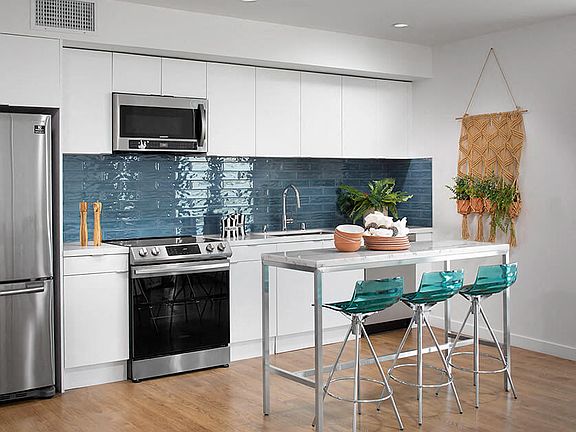 - Exterior features: Coffee Bar in Lobby, Deluxe Terraces*, Expansive Windows, Modern Kitchen and Bathroom Cabinetry, Night Patrol, On-Site Management, Parcel Lockers, Pet Washing Station, Rooftop Deck, Samsung Smart Ovens, Samsung Stainless-Steel Appliances, Smart Home Technology in Each Apartment Home, Smart Light Switches, Smart Thermostats, Soft Closing Cabinets, Spacious Closets