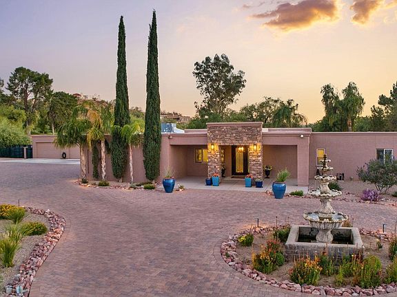 Located on a private, 1-acre lot on the 14th hole of the popular Oro Valley Country Club golf course, this completely renovated home w/ a 6-car garage & guest casita has it all. Premium homesite w/ lush, mature vegetation, located at the end of a cul-de-sac w/ mountain, sunset, & golf course views. Seamless indoor/outdoor living designed for enjoying the best of AZ living. A circular driveway lined w/ pavers & a beautiful fountain leads to a covered entry featuring stacked stone accents & a custom wrought-iron & glass front door. The kitchen opens to a spacious great room w/ a formal dining area & a wet bar w/ a wine fridge. Features of the renovated kitchen include leathered granite & quartz countertops, a waterfall island w/ a breakfast bar.. Cont..