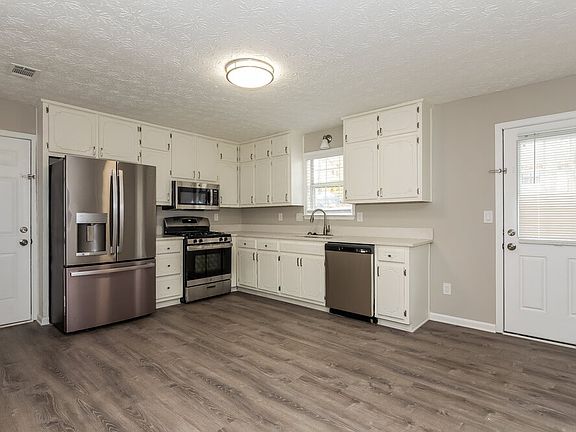 With its lovely front porch and concrete back patio, this Jonesboro, GA rental home offers great outdoor spaces along with its three bedrooms and two bathrooms within 1,176 square feet. Display photos or keepsakes on the white mantel of the corner fireplace in the living room, which has a modern feel thanks to the updated wood-look vinyl plank flooring. Follow the pass-through window into the kitchen to find elegant all-white cabinetry and matching quartz countertops. Home cooks will appreciate the premium-quality stainless steel appliances. A door from the kitchen leads to the attached garage. The primary suite comes with a lighted ceiling fan and a large walk-in closet, along with updated fixtures in the adjoining private bathroom. Come tour this pet-friendly smart home today!