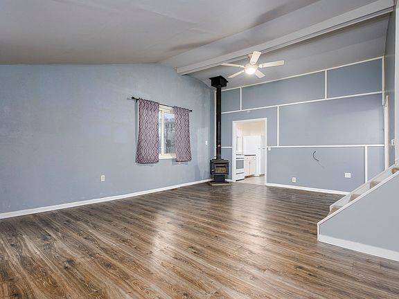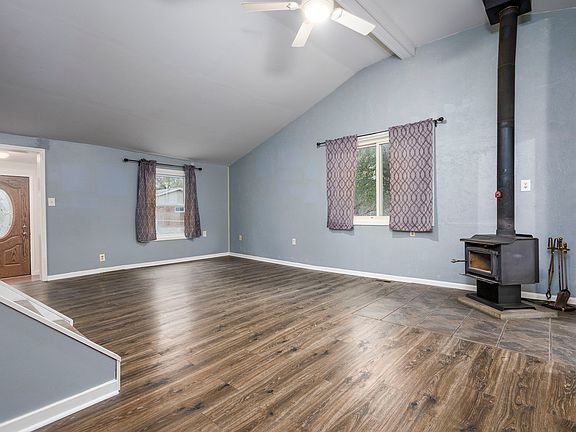 This home features an open living room with vaulted ceilings and a cozy wood-burning stove, two main-floor bedrooms (one with direct access to a full bath), and a private upstairs primary suite with its own bath. The large yard is mostly fenced and includes a covered deck and paver patio, perfect for relaxing or entertaining.