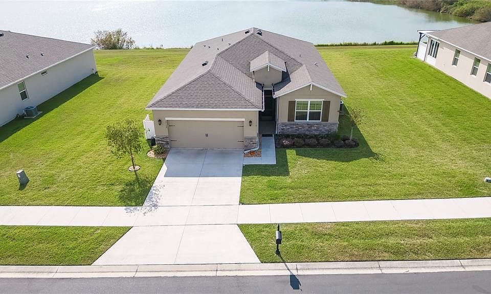 STUNNING, WATERFRONT 2019 AVON MODEL HAS OPEN FLOOR PLAN IN GATED 55+ COMMUNITY OF JB RANCH WITH LAWN CARE/ TRASH AND ALMOST NEW AMENITIES ARE INCLUDED AT LOW HOA FEE OF 169/MONTH!! HOME IS POSITIONED HIGH ABOVE THE WATER FOR INCREDIBLE OVERSIZED SCREENED IN LANAI VIEWS!! ENJOY FISHING, KAYAKING AND PICTURESQUE VIEWS. CURRENT OWNER HAS SPENT CLOSE TO 30K TO MAKE TO TAKE THIS HOME TO ANOTHER LEVEL WITH ALL NEW CUSTOM LIGHTING, BOTH FRONT AND REAR SCREENED IN ENTRY AND COVERED LANAI, UPGRADED BERBER CARPET IN MASTER, EPOXY GARAGE FLOOR, GUTTERS, UPGRADED HOT WATER RECOVERY TANK TO KEEP HOT WATER CONTINUOUS. FROM THE MOMENT YOU WALK INTO THE HOME THERE IS DIRECT VIEWS OF POND AND BEAUTIFUL TILE ENTRY. THIS LEADS TO THE OPENNESS OF LIVING ROOM KITCHEN AND DINING AREA. KITCHEN OFFERS GRANITE COUNTERTOPS, ISLAND WITH ROOM FOR 4 TO 5 BAR STOOLS FOR ADDITIONAL EATING SPACE. STAINLESS STEEL APPLIANCES AND WALK IN PANTRY. KITCHEN OVERLOOKS DINING AREA. JUST BEHIND THAT IS DOUBLE SLIDING DOORS LEADING TO LANAI. TO RIGHT OF ENTRY IS THE 2 SECONDARY BEDROOMS THAT SHARE THE UPGRADED 42 INCH VANITY WITH CORIAN WITH UPGRADED BRONZE FAUCET, COMBO TUB AND SHOWER WITH SURROUND TILE. ONE OF THE SECONDARY BEDROOMS HAS CARPET AND THE OTHER HAS LAMINATE. THE OWNERS SUITE IS POSITIONED IM BACK LEFT CORNER OF HOME FOR PRIVACY AND DIRECT WATERFRONT VIEWS. THE OWNERS SUITE FEATURES GRANITE COUNTERTOP DOUBLE VANITY WITH MEDICINE CABINET BUILT INTO WALL AND SURROUND TILE SHOWER WITH GLASS DOOR LEADING TO WALK IN CLOSET. INDOOR LAUNDRY ROOM IS NEAR GARAGE ENTRY INTO HOME. GARAGE HAS VERY NICE SHELVING AND STAINLESS WORKBENCH, EPOXY FLOORS AND INCREDIBLE LANDSCAPING JUST OUTSIDE. ADDITIONALLY OUTSIDE THE COVERED LANAI IS A 8 X 10 GRILLING AREA OVERLOOKING POND! DRAPERIES AND BLINDS STAY WITH HOME. ALL OF THIS IN A LOW HOA COMMUNITY NEAR ALL NECESSITIES INCLUDING BRAND NEAR PUBLIX GROCERY STORE 2 BLOCKS AWAY!! CHECK OUT THE COMMUNITY AMENITIES ATTACHED!!