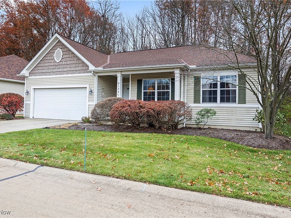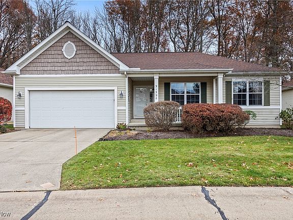 Olmsted Falls Ranch featuring low-maintenance living at its finest, in the desirable Falls Pointe community! Set against a wooded backdrop, the backyard has privacy to be enjoyed from the living room , Kitchen and off of your deck. This home features vaulted ceilings, gas fireplace and a full basement! The private primary suite features tray ceiling, garden tub, double closets and large double vanity area. The second bedroom and a full bath are perfect for guests. Located in the sought-after Falls Pointe community, your HOA includes lawn care and snow removal and a neighborhood pool. If you're looking to simplify or just enjoy one-floor living in a private setting, this home is the perfect fit.