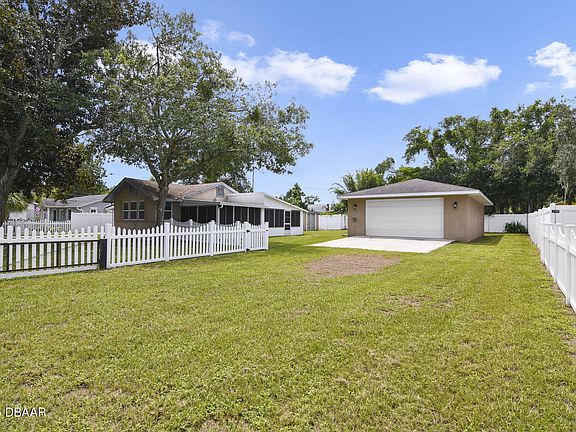 Just five minutes from the sandy shores of New Smyrna Beach, this beautifully maintained 2-bedroom, 2-bathroom home offers the ideal combination of coastal convenience, privacy, and versatility. Nestled in a friendly and peaceful neighborhood near boat ramps, the Intercoastal Waterway, and scenic parks and beaches , this location offers a great retreat while keeping you close to all the area's best outdoor recreation. Situated on an oversized double lot, the fully fenced property is perfect for anyone needing extra space—featuring a wide 16' swinging gate that opens to an impressive 24' x 36' heated and air-conditioned garage. Outfitted with a 100-amp panel, a commercial 5 HP compressor with plumbed lines and a 50 foot hose reel hookup, it's a dream setup for car enthusiasts, collectors or boat and motorcycle storage. Additional amenities include a 20' carport with a partial concrete driveway and ample parking for RVs, trailers, or extra vehicles. Inside the home, you'll find new impact-rated windows throughout, a 200-amp electrical panel, and thoughtful updates that add both comfort and durability. The spacious enclosed Florida room provides the perfect space for entertaining year-round. A separate 10' x 24' utility shedcomplete with electric and a 30 amp service outlet in the rear for R/V hook up is ready for your workshop or storage needs. Whether you're a hobbyist in need of room to tinker or simply looking for a quiet beachside escape with all the right extras, this unique property has it all. Make your appointment today !