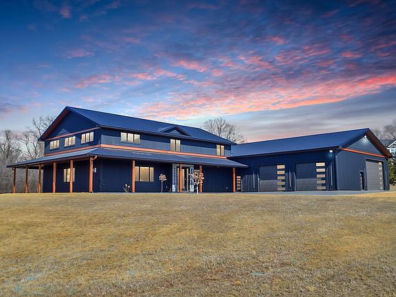 This one is a showstopper! An amazing "barndominium" on a 2 acre lot in Hudson schools. At the end of the cul-de-sac you'll find this sleek home with a massive garage/workshop. The wraparound patio gives the home a classic feel while the steel siding offers a modern twist. Entering the home you'll find an open concept layout ready for your interpretation. The soaring vaulted ceilings are lined with wood and accented with darker wood beams - giving warmth to an open and airy great room. If that wasn't enough warmth - the entire main level has in-floor heat! A fantastic combination of storage and shelves for display means everything is accessible in this well appointed kitchen. The six-burner gas stove with grill, double ovens, and wall mounted pot filler is any chef's dream. Hosting a large gathering is a breeze with this expansive center island. The butler's pantry offers even more storage and has a great sink for prep work. Down the hall is the main floor primary bedroom with more classic styling and modern accents. From the hatch patterned wood beams on the ceiling to the custom shelving in the large walk-in closet and into the stately 5-piece private primary bath - this is sure to be your luxurious retreat at the end of the day. Don't worry - you don't have to share - the main floor has a great 3/4 bath for guests. Upstairs, a loft overlooks the great room on the main floor and leads to three more bedrooms. One secondary bedroom has a walk-thru ensuite bath and it's own walk-in closet Two more secondary bedrooms round out this level. Back downstairs, just past the main level laundry room is access to the heated and insulated garage - there's no shortage of space out here - and you even have a 3/4 bath to wash up before you head inside. This is the home you've been looking for!