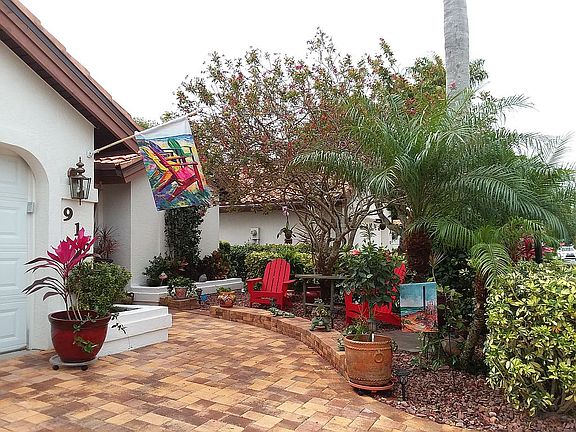 Two-car garage with paver driveway that fits 2 additional cars with lush, tropical curb appeal