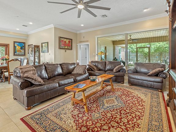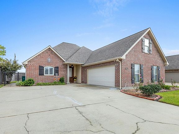Discover serene comfort and timeless style in the gated Forest Park Garden Homes Subdivision. This immaculately maintained home is situated on a cul-de-sac lot in the Maplewood area of Sulphur. This beautifully upgraded 3-bedroom, 3-bath home spans over 2,340 square feet across 1.5 stories, combining natural light, thoughtful updates, and graceful design. Step inside to soaring ceilings and a dramatic wall of windows that brighten the airy living room, flowing seamlessly to a large screened-in patio and private fenced backyard with a custom water fountain feature—perfect for entertaining or quiet relaxation. The formal dining room connects to a gourmet kitchen featuring granite countertops, ultra-customized cabinetry with pull-out drawers and a corner lazy Susan, a walk-in pantry, a new Café stove, LG refrigerator, upgraded vent hood and a new dishwasher. The first-floor primary suite offers true retreat living with a whirlpool tub, separate shower, granite-topped vanity, and an oversized walk-in closet. Hand-scraped wood floors enrich the first-floor bedrooms, while ceramic tile provides lasting elegance throughout the main level. Upstairs, a spacious game room or 4th bedroom with its own full bath offers endless flexibility as a media lounge, guest suite, or creative workspace. Upgrades abound, including a 2024 5-ton high-efficiency HVAC system with transferable warranty, 4 year old roof, new hybrid high-efficiency water heater, large utility room with extra storage and Samsung front loader washer and dryer will remain, new exterior lighting, and a two-car electric garage. Additional highlights include a full security system, a sprinkler system for easy lawn care, an oversized garage with a large enclosed storeroom for all your extras. Situated in coveted Flood Zone X for added peace of mind, this home blends timeless style with modern convenience. Schedule your private showing today and experience how this Forest Park gem delivers comfort, elegance, and value.