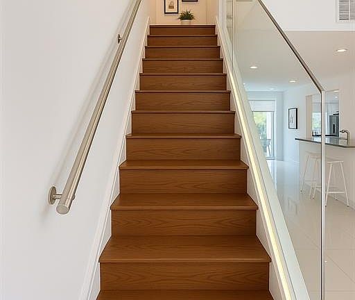 The spacious living area is highlighted by a custom-designed staircase of wood and glass with built-in lighting — a true centerpiece of the home.