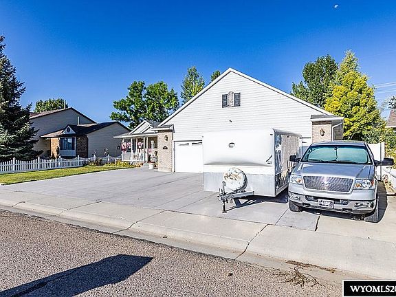 Beautifully maintained 5 bedroom, 3 bathroom home, with 3 car garage, RV parking, and mature landscaping. The main level of the home opens up into the living and formal dining space. The living room has a gas fireplace with thermostat and passes into an eat-in kitchen area and the kitchen. There are three bedrooms on the main level - including a primary bedroom with private bathroom and two closets. The laundry room is also on the main level. The basement has a cozy family room with a wet bar and beverage refrigerators and another fireplace. There are two more bedrooms downstairs and a large bathroom. There is also a dedicated storage room downstairs as well as extra storage space or workspace in the utility room. The three car garage has a heater that will stay with the property. The front and back yards are both fully landscaped with sprinkler systems. The driveway has tons of paved parking. The backyard is fully fenced with mature trees, a pergola/outdoor entertaining space, storage shed, and small greenhouse. To schedule your tour of this home, call or text Broker Emily Lopez with High Country Realty at 307-389-1667 today!