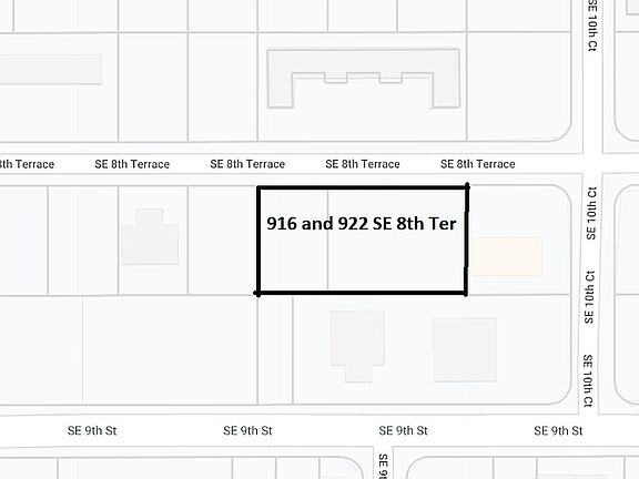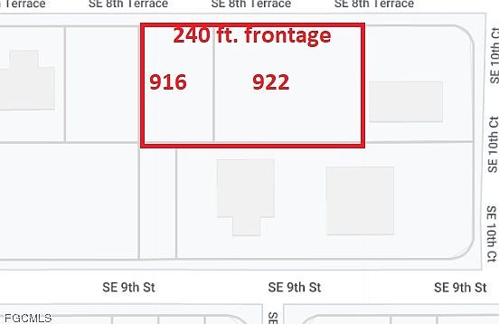 This sale includes property address #916 (appox. quarter acre) and #922 (approx. half acre) SE 8th Terrace. A rare opportunity to own +/- 240 feet of road frontage, zoned Professional (P) with future land use Commercial Professional (CP). All city utility assessments paid in full. This is 2 parcels being sold together for a total of 6 lots. On the outer edge of Cape Coral Industrial Park with great access to Del Prado Blvd. This zoning allows for multiple uses. Multi Family buildings on North side of same street--maybe rezoning to multi family is possible? Tax amount shown is total amount paid for both parcels.