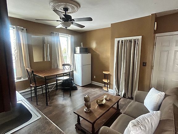 This efficiency apartment is perfect for one person, featuring a small bedroom with space for a twin bed and dresser, and a compact kitchen with a table and three chairs. Utilities are the tenant's responsibility.