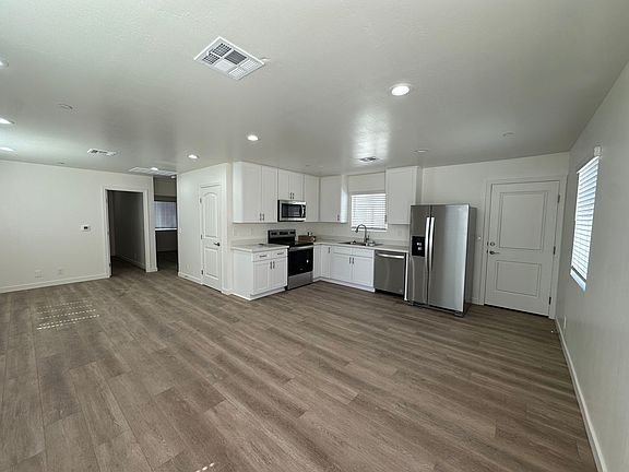 Beautiful 2 bed, 1 bath "cottage" w/ solar & high efficiency AC! Units do not share any walls! Generous great room w/ stunning kitchen that overlooks the dining & living space. Beautiful quartz countertops in the spacious kitchen w/ plenty of cabinet space, walk-in pantry & stainless steel appliances (fridge included)! Appreciate luxury vinyl plank flooring & window blinds throughout. Washer & dryer are conveniently included within the unit. Lovely backyard space to enjoy as well. This energy efficient building comes fully equipped w/ 11 solar panels that produce roughly 4,000 KwH a year, high efficiency AC & heat pump, energy efficient windows, fire suppression system, 2x6 construction w/ R-19 insulation in walls & R-38 in the ceilings. The unit is all electric. Tenant to pay water, garbage & power.
