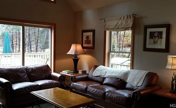 Privately set gorgeous home on 5 acres of wooded property. Cathedral ceilings with custom glass windows brings plenty of sunshine into living, dining area and kitchen. Sliders open to sprawling deck surrounding heated pool for beautiful days and the cool mountain nights. Perfect for quiet getaways or friends and family gatherings. Large bedrooms and baths with plenty of sleeping room. Basement bar and game room offer plenty of fun for all ages. Direct TV thru out home including game room. Children's playroom and garage complete this house. Furniture included. Weekends or year round living, time for some R & R!