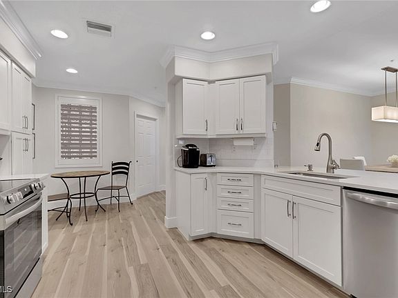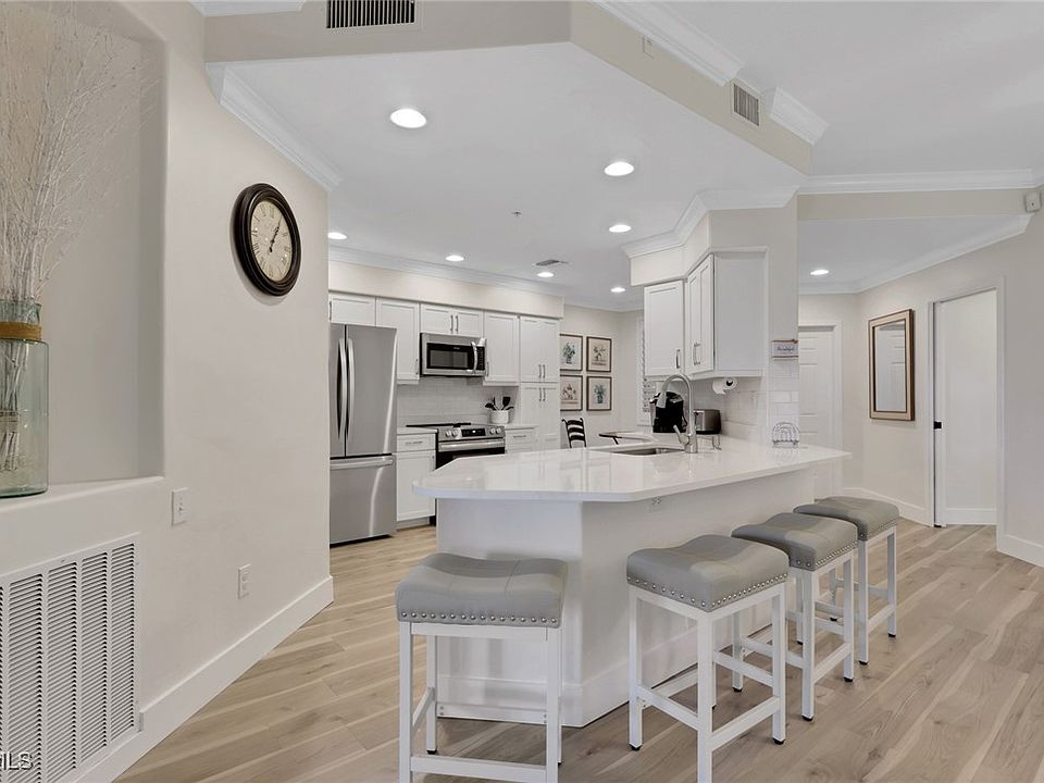 Welcome home to this beautifully renovated 3-bedroom, 2-bath condo with tranquil water views. This turnkey residence comes fully furnished and move-in ready, with every detail thoughtfully updated for modern comfort and style. Enjoy elegant crown molding and plantation shutters throughout, a 2023 hot water heater, 2023 A/C, and a stunning kitchen featuring stainless steel appliances, a single large sink, luxury vinyl plank (LVP) flooring, and a washer and dryer.