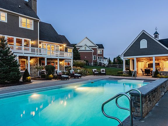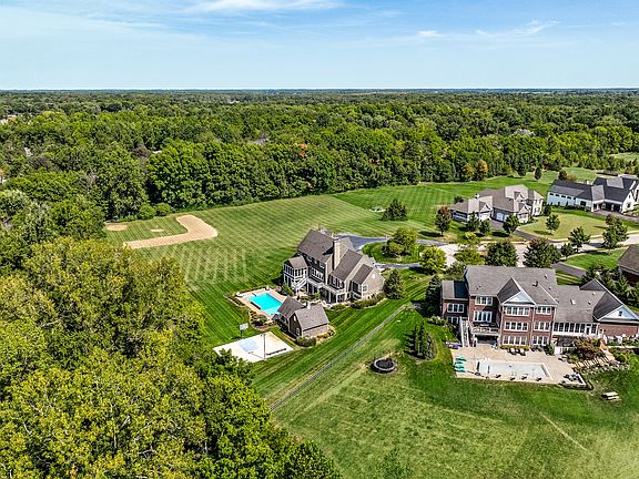 Nestled on 4 private acres at the end of a quiet cul-de-sac, this extraordinary 8-bedroom, 7 full and 2 half bath estate offers the perfect blend of elegance, warmth, and everyday livability. It's more than just a house....it's a home. Offering 9,900+ finished square feet, this home was designed with a calming, inviting flow. The enchanting floor plan showcases soaring ceilings, abundant natural light, and exquisite craftsmanship at every turn. The main level features newly refinished hardwoods throughout, anchored by a show-stopping great room with an oversized stone fireplace and coffered ceilings. The dreamy chef's kitchen is a true centerpiece, featuring double commercial-grade gas ovens and ranges, quartz surfaces, custom backlighting, and seamless access to both formal and casual dining areas. The primary suite is a sanctuary of its own, complete with a private sitting room, cozy fireplace, spa-inspired bath, and direct access to the outdoor deck. Up its own private staircase is a fully outfitted in-law/guest suite perfect for extended stays. The finished lower level is equally impressive, bathed in sunlight through two sets of French doors and designed for both entertainment and relaxation. Highlights include a state-of-the-art theater room, full wet bar, wine cellar, exercise room, and two additional fireplaces. Outdoor living is equally spectacular. Framed by lush woods, the in-ground pool with poolhouse creates a resort-like setting, while a basketball court, soccer field and baseball diamond offer endless recreation. Enjoy 'smores by the firepit, watch pool shenanigans, or enjoy a happy hour cocktail from the enormous deck--the choice is all yours. Property parcel includes 2 lots, allowing for additional building options. PVE Elementary and ZMS Middle School.