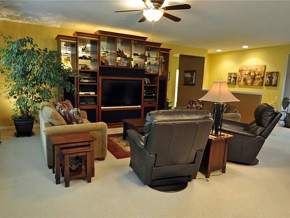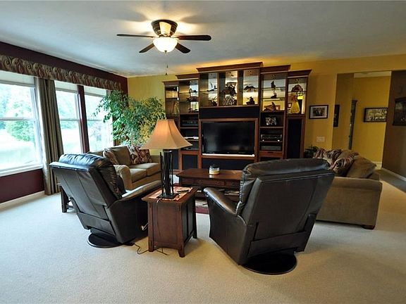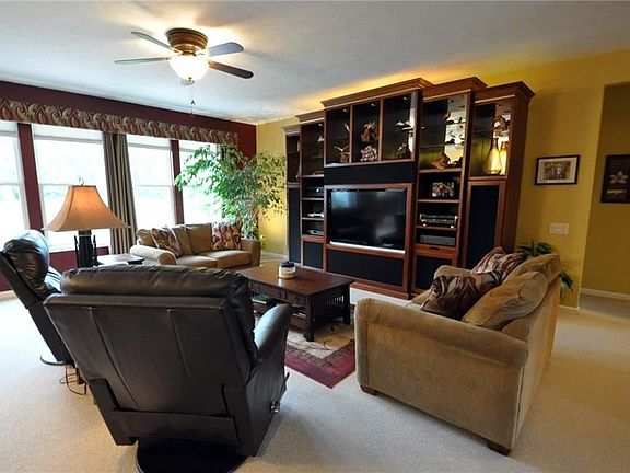 Arguably one of the nicest homes in Pioneer Ridge on the nicest lot, this home has been carefully decorated and updated. The gourmet kitchen has wood flooring, granite counters, Ceramic backsplash, under and over cabinet lighting, GE Profile appliances including a 5 burner gas cooktop, double ovens, microwave, refrigerator and dishwasher. There is a large pantry, a built in desk with granite, an amazing custom made wine cabinet and a large center island. Relax in the sunroom with ceramic flooring, or on the stamped concrete patio under the 20' retractable awning, and enjoy the water view and the woods in the background. The master suite has a tray ceiling with fan, a bank of windows for natural light and a view of the pond and blackening shades for privacy. The master bath has double sinks, soaking tub and double walk in closets. The office has custom built in desk and cabinets on two walls with granite. The lower level is a wine lovers paradise. One look and you will love the attention to detail and the craftsmanship that went into the design of this area. There is a pool room with all the equipment, a media room with surround sound, a workshop area with insulated walls, a full bath with shower, a sink, dishwasher and fridge, ceramic flooring, a storage area with another sink and sump pump with battery backup. The owners have invested over $100k since purchase. The office could be a third bedroom. Basement has two egress windows, so a bedroom could be built there also.