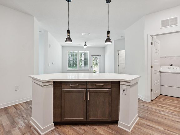 In-home washer and dryerStainless steel appliance packageEat-in island kitchensLinen cabinetsCurved shower rodsSubway tile kitchen backsplashPendant lighting
