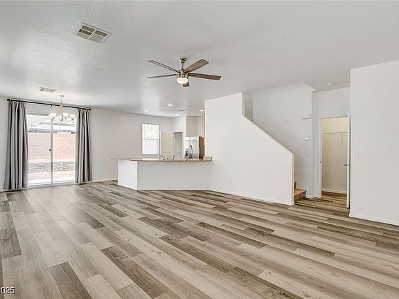 This beautifully upgraded 4-bedroom, 3-bath home is move-in ready with fresh paint and stylish vinyl plank flooring throughout. The kitchen shines with brand new stainless steel appliances - including a stove, refrigerator, microwave, and dishwasher - making cooking at home a joy. A convenient downstairs bedroom and bathroom are perfect for guests or a home office, while upstairs features three more bedrooms and a spacious loft ideal for a playroom or second living area. The private backyard is a low-maintenance "blank slate," ready for your personal touch. This home is nestled at the end of a quiet cul-de-sac in a community that offers fantastic amenities: pool, spa, playground, fitness center, and a park. It's just minutes from major retailers like Walmart and Lowe’s, popular restaurants, and has quick freeway access to the 215.