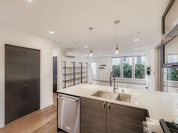 Welcome to this modern 3-bedroom, 2.5-bath Seattle townhouse featuring luxury vinyl plank flooring, a built-in microwave, in-home washer and dryer, and a full security system with SimpliSafe monitoring ready for you to begin service. The bright and inviting primary bedroom includes a walk-in closet, en suite bath, and private balcony, while mini-split heating/AC units and ceiling fans ensure year-round comfort throughout the home. Additional highlights include a handy storage shed, one off-street parking space, and a fully furnished rooftop deck perfect for relaxing. With professional landscaping included, this townhouse offers both style and convenience in the heart of Seattle.