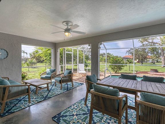 Welcome to this charming 3-bedroom, 2-bathroom private pool vacation home in Punta Gorda Isles, perfect for a serene southwest Florida getaway. Situated just over a mile from the vibrant shopping and dining of historic Punta Gorda Downtown, this single-story home offers a spacious open lot for a peaceful stay. The private pool faces south, ensuring maximum sun exposure, and the home comfortably accommodates up to six guests. This home features a fully equipped kitchen with dining for six at the dining table, making it ideal for family meals. Enjoy the convenience of a propane BBQ available for guest use, and take advantage of the two bicycles provided for exploring the area. The master bedroom boasts a king-size bed with a private attached bathroom, while the second bedroom offers another king-size bed, and the third bedroom includes a queen-size bed. For those traveling with pets, this dog-friendly home includes a fenced-in dog run and allows up to two dogs with a nonrefundable fee of $250 plus tax. Pool heating is available at an additional cost of $200 per week or $500 per month plus tax. Parking is available with a two-car garage and driveway, although boat trailer or RV parking is not permitted per HOA guidelines. Located in a prime area, this home is just 2 miles from Gilchrist Park and Fisherman's Village, and 1.4 miles from the Publix Supermarket and Peace River Beer Company. The Punta Gorda Saturday Farmers Market is also 2 miles away, and the SunSeeker Resort Charlotte Harbor is 4 miles from the property. For travelers, the Punta Gorda Airport is conveniently located 5 miles away. This smoke-free home offers complimentary WiFi and on-site parking. Guests can enjoy a seamless check-in process with online email check-in and 24/7 on-call maintenance. A starter welcome packet is provided, including basic toiletries and cleaning supplies, but guests are responsible for replenishing these items. The BBQ must be cleaned upon departure to avoid a $56 fee. No boat trailer or RV parking is allowed in the driveway, but local storage facilities are available nearby.