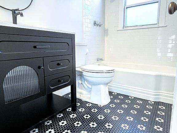 The bathroom has new mosaic floor tile, vanity, Kohler toilet, and all new plumbing.