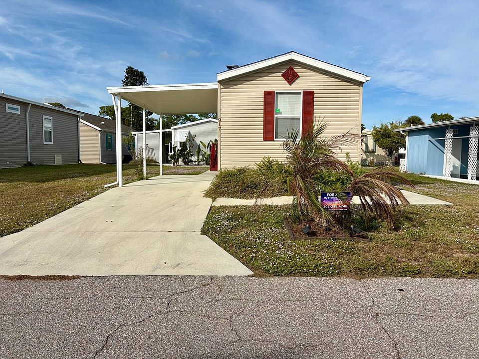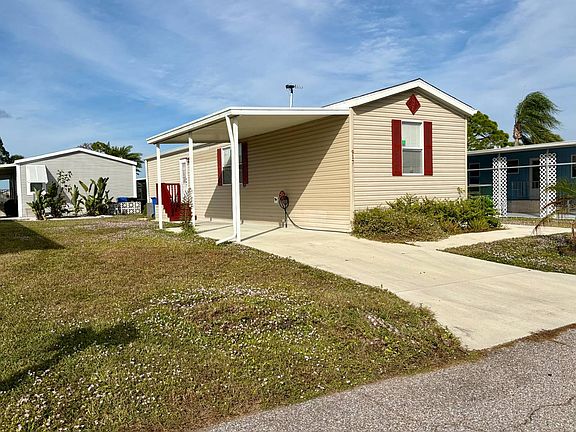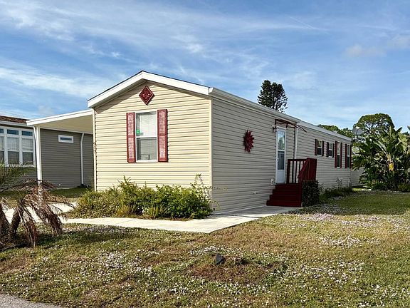 "Compact Outside, Spacious Inside" 917 Guadeloupe is a 2013 home in great condition that offers a smart way to live the dream just two miles from the Gulf Coast and beaches. This single wide with two bedrooms and two full baths is fully furnished and deceivingly spacious inside, making it a spectacular value. The home features beautiful luxury vinyl plank flooring with extra tucked away in a closet for future use, while the master bedroom and guest rooms are carpeted for added comfort. The covered carport accommodates two vehicles, and there is ample space on either side of the home to add an outdoor patio for BBQs, shaded umbrellas, and relaxing chairs. The back view is lovely, with neighbors showcasing attractive landscaping. Inside, the unusual split floor plan provides privacy for both guests and owners. The master bedroom has room for a queen bed, two closets with an alcove between them for a dresser or desk, vaulted ceilings, and an ensuite bath. The bathroom includes a spacious vanity with storage below, a walk-in shower with glass doors with a decorative shower curtain, plus a linen closet. Three ceiling fans throughout the home keep the space cool and comfortable. The open concept kitchen, living room, and dining area make entertaining easy. The kitchen is equipped with all appliances, plenty of cabinet and counter space, and a double corner sink under a window bringing in plenty of sunshine. A dining table with chairs seats two to four, while the living area includes a TV, sofa, and room for occasional chairs or replace it with a sectional. The decorative choices are endless. On the opposite side of the home, there is a full bath with tub and shower, vanity, and flush, along with a second bedroom that currently has a futon bed and closet. This space can serve as a guest room, den, or office. As a bonus there is a stacked washer and dryer conveniently set in an alcove in the hallway. This is a turnkey home with all the furnishings minus kitchen essentials. There is also a door needing minor repair. This home is not one to pass up, offering a deceivingly large space inside and out at a spectacular price for being fairly new. The Bay Indies amenities are no comparison with tennis, pickleball, bocce, shuffleboard and even corn hole. The are 3 heated pools, and spas beckon with exercise swims and relaxation, catch and release fishing, ponds with an abundance of waterfowl and a resident swan, 2 clubhouses, 3 mile walking/biking path, kayak launch and storage, and indoors there are numerous state clubs, crafts, gym, cards, trivia and horse racing bingo nights, scheduled dinner functions and concerts and a full time recreational coordinator. Just two miles from restaurants, shopping and white sandy beaches in downtown Venice and three close by airports. This is a hot property at an unbelievably great price, plus a Tiger wood pop stroke, two course putting green and a great casino just a short distance away. Let's move and have some fun! All listing information given to us is considered appropriate and reliable but should be independently verified through personal inspection by appropriate professionals. Home must be maintained to the Community prospectus. The lot rent is determined by the Community office and covers all amenities offered including property taxes and lawn maintenance.