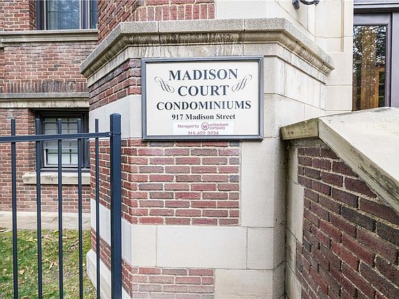 Welcome home! The Madison Court Building is waiting for you. With an easy walk to Syracuse University, Crouse, Upstate, and Restaurants & Shops, the location couldn't be better. This secure building, once a schoolhouse, is loaded with charm. Unit 207 welcomes you with gleaming hardwoods, high ceilings, beautiful natural woodwork and an abundance of natural light. This 2 bedroom 1 bath unit has been meticulously maintained. With it's original chalkboard from it's schoolhouse days, it has old world charm shining through. The updated kitchen and bath with gorgeous granite and tile backsplashes offer a truly turnkey home. With outstanding views, you'll love living here. In unit laundry makes living here a breeze. Or use the state of the art laundry room in the building. The building has a meeting space, gym, gated parking, and your own locked storage space. Just out the side door, you'll find your assigned parking space in the gated parking lot. Don't miss this beauty. See it today and start living the easy condo life in the heart of SU.