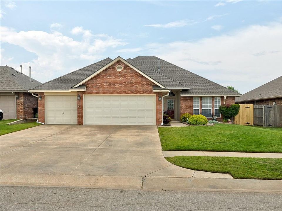 Come check out this 3 bed + an office in a quiet cul-de-sac nestled just outside of the main city hustle and bustle. This home has a great functional floorplan with a very open concept. The large living room has wood look flooring, a floor to ceiling fireplace, and is open to the kitchen and dining spaces. The kitchen features stone backsplash, stainless steel appliances, and tons of cabinets and a pantry. Eat in dining space is large and overlooks the pond in the backyard. Formal dining would make a great flex space for a playroom or office if you need more than one. This space could eventually be enclosed for a 4th bedroom as well! The primary bedroom is spacious, with double vanities, jetted tub, and a walk in closet with hanging space for days. Both secondary bedrooms as well as the office are nicely sized. The only carpet in this home is in the bedrooms, and is in good condition. The pull down projection screen can stay, house is pre-wired for 9.1.2 surround sound, and attached speakers on living room walls stay. The backyard is the place to relax, with a gorgeous rock pond, the cutest she shed around, and fresh sod where a pool used to be. New roof September 2022, full sprinkler system, and storm shelter. HVAC was just thoroughly serviced, received a new thermostat, and all new freon. This home has all the space, and opportunity to make it your own. Our sellers have loved and cared for this home, and have kept it in top condition for it's new owners.