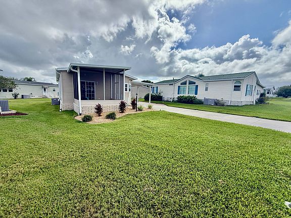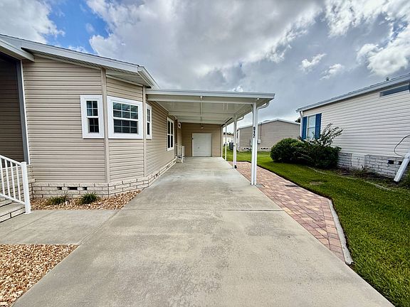 Located in Water Oak Country Club Estates in Lady Lake Florida, an active 55 plus land lease community. This 2016 Skyline model has it all! A bright open floor plan with vinyl plank flooring in the main living areas. The entire interior has been freshly painted, as well as the closets. Exterior window trim has also been freshly painted, and sealed all joints. A/C was just serviced and home has been pressure washed twice a year as well as quarterly pest control. Nice carpet in both bedrooms and they were both just professionally cleaned. Beautiful soft closing cabinets and pull-out drawers in the kitchen. A bay window over the sink. The classy yet functional island is great for meal preparation, with extra storage areas and room to eat meals. Lots of windows and high ceilings make this home feel comfortable and airy. A relaxed living area and space for dining. An indoor washer and dryer for convenience. The tasteful modern furniture will convey with this must-have house. Enjoy two nice-sized bedrooms. The primary bedroom has customized closet organizers. You will love the stylish, tiled bathrooms. Enjoy your morning coffee and gorgeous sunsets on the screened lanai with epoxy floor and new pull-down shades in the lanai as well as on the carport, that provide sun protection and privacy, Located on a quiet cul-de-sac. Spacious driveway and paver golf cart driveway. The utility shed has additional storage and shelving and is equipped with a roll up door for golf cart storage. This impeccably kept home is a must see! Water Oak is a premier active 55+ land lease community in Central Florida. A peaceful community with rolling hills, historic trees, and a newly renovated 18-hole championship golf course. Enjoy a gated community that mows your lawn as you live a resort lifestyle with two beautiful clubhouses, heated pools, a sports center, a restaurant, and a variety of clubs and activities. Call to see this home today!