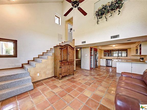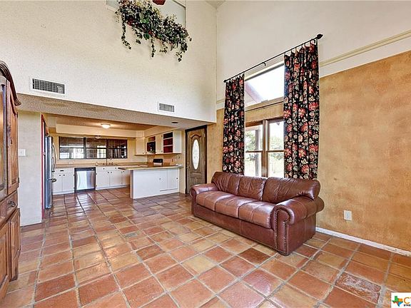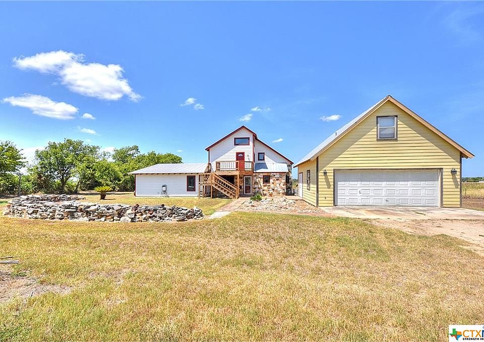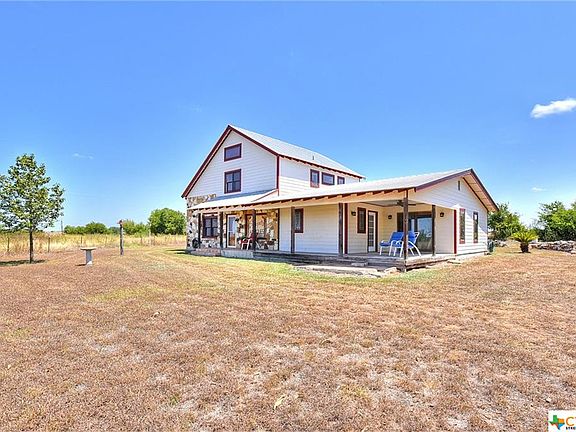 NAVARRO SCHOOL DISTRICT (noted as a quality school district), low taxes, 5 acres of country lifestyle, yet close to Seguin and New Braunfels. Broad views of pasture land from the front porch, upstairs deck, and the covered patio. Drive down the lane to the house. Stairs go up to deck and upstairs bedroom and bathroom. Enter through the back door. Saltilla tile floors downstairs. Newer Jeld Wen windows. MASTER BEDROOM, ENLARGED KITCHEN, AND BATH ADDITION of 716 sf needs to be completed by a discerning buyer (electrical/plumbing in place). The garage apartment was used as an office or could be a bedroom with bathroom. Extra large garage and even a TUFFSHED (approx 16x20') utility bldg. for a workshop or extra storage. Lots of space for your animals and FHA projects. The third floor room is a bonus/play room with built in drawers and plenty of storage space.