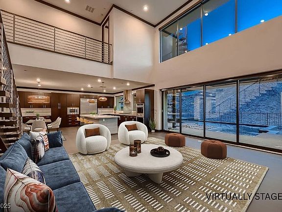Welcome to Sky Terrace, where elevated desert living meets architectural brilliance. Designed by Blue Heron, this modern masterpiece captures sweeping views of the Las Vegas Strip from its private rooftop deck. Inside, natural light and clean lines define the expansive great room, gourmet kitchen, and sleek wine bar—perfect for refined entertaining. A tranquil courtyard and resort-style pool offer effortless indoor-outdoor flow. The home features three ensuite bedrooms with spa-like baths and custom closets—including a main-level suite—plus a flexible fourth bedroom near a full bath. The property has recently undergone a remodel with over $60,000 in enhancements. It features elegant black crown molding and baseboards, new flooring on the lower level, modern black recessed lighting, a fresh interior paint job, a newly coated roof, and upgraded pool tiles with necessary repairs.