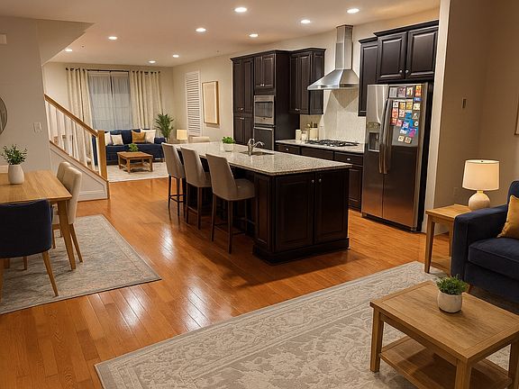 Luxury Townhouse with open-concept main level with hardwood flooring and abundant natural light. Modern kitchen with stainless steel appliances, granite countertops, and ample cabinetry.