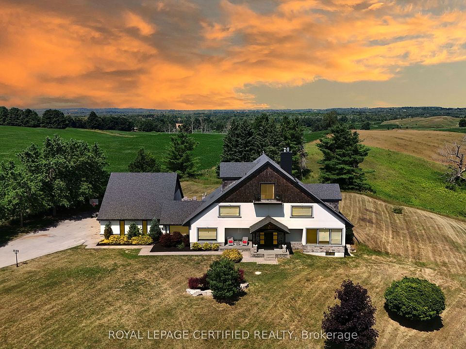 Poised atop a majestic 1.75-acre hilltop estate, this custom-built 2 1/4 storey masterpiece redefines luxury living with sweeping panoramic views and uncompromising design! This 4-bedroom, 4-bathroom masterpiece is a perfect blend of modern elegance and country charm. The gourmet kitchen is a culinary showpiece, appointed with two statement islands, premium Sub-Zero and Wolf appliances, and bespoke cabinetry tailored for both daily living and entertaining. Adjacent, sunken family room accented by coffered ceilings and a separate formal dining room with vaulted ceiling sets the stage for memorable gatherings. Retreat to the luxurious primary suite with its own vaulted ceiling, dual-sided fireplace, and spa-like 5-piece ensuite. The fully finished walkout basement expands the living space and opens to a private outdoor retreat. Outside, resort-style living awaits an inground saltwater pool with a tranquil waterfall is set among professionally landscaped grounds, offering ultimate serenity and seclusion. An oversized 4-car garage adds practicality to this one-of-a-kind property. This is more than a home its a private, architectural statement for the most discerning buyer.