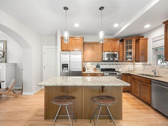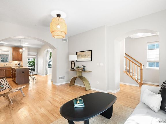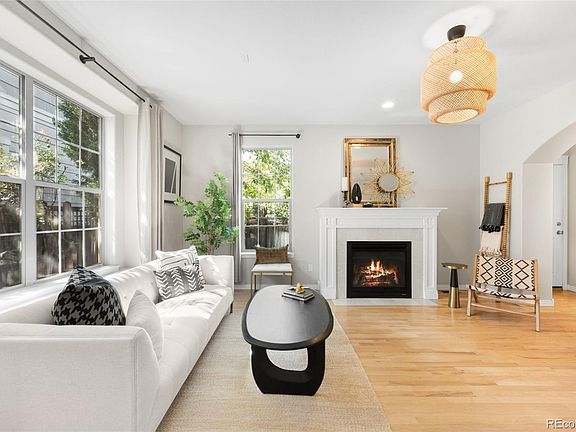 This cheerful home is situated in the middle of all the wonderful amenities of Central Park. A charming lot, nestled in a tree-lined courtyard provides the perfect balance of a social yet private location. This popular floor plan has blonde hardwoods that shine throughout the main level. An efficient kitchen boasts a true prep island to make cooking a joy and creating the perfect setting for entertaining, especially with the dual basin sink placed under the window, where a sink belongs. The gas fireplace is a statement that sets the tone for festive holidays or a quiet evening in. Upstairs, find two bedrooms that share a tidy full bath and a convenient laundry center. The primary suite provides a sunny retreat with architectural details, en-suite bath with ample natural light & an awning window to let fresh air in all year round, plus a closet completed by Elfa. Enjoy the versatility of the finished basement, built to accommodate an office, homework or gaming space, a theater or a rumpus room and impressive storage options. The cozy bedroom in the lower level is adjacent to a fourth bathroom with bright, clean finishes. The yard is a hidden gem not common for Wonderland homes in the area. Bring your gardening gloves or just enjoy time outside under the shade or the stars. All this, just steps from Westerly Creek Open Space, Central Park, Rec Center, Stanley Marketplace, and Eastbridge restaurants & shops. Buyer to verify schools, 80238 is a choice neighborhood.