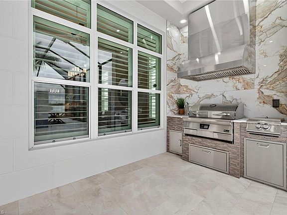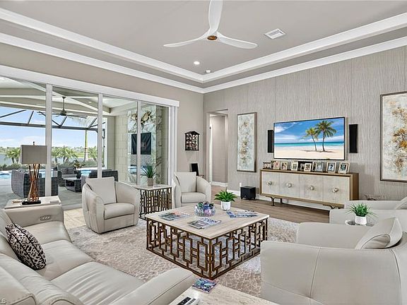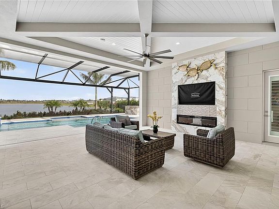 Welcome to 9171 Wisteria Way in desirable new community of Seven Shores. This 3 Bedroom+Den/3.5 Bathroom Sarasota model home is sited on the preeminent lakefront lot affording stunningly gorgeous expansive waterfront views making one feel as though you're living in the Caribbean. This truly exceptional new home features the ideal blend of timeless elegance and modern luxury. Enter this 3500 square foot entertainer's dream home into a welcoming foyer opening to a grand open-concept living space with soaring ceiling and gorgeous upgraded wide-plank light oak hardwood floors. Wall of glass opens out to the outdoor living area and waterfront view seamlessly blending indoor/outdoor living. Fabulous outdoor living area with linear fireplace, built-in outdoor kitchen with upgraded Pellet grill and a breathtaking saltwater pool, spa and sun shelf with endless waterfront views and upgraded landscaping. Gorgeous living room, convenient dining area and a true chef's eat-in kitchen replete with upgraded KitchenAid appliances including natural gas cooktop, shaker cabinetry, contemporary quartz countertops, oversized island and butler's pantry ideal for entertaining. Master suite oasis features a spacious bedroom with water views plus a spa-like master bathroom with walk-in shower, separate vanities, separate water closet and 2 walk-in closets with CA Closets custom built-ins. On the opposite side of the home are 2 guest bedrooms, 2 bathrooms plus a sitting area that would make a great home office, home gym or family room for guests. Mud room with custom built-ins, 2 car attached garage with epoxy floor and mini-split AC plus a whole house generator. This truly exceptional home with endless upgrades is move-in ready. Seven Shores community amenity center offers a wide range of features designed for comfort, activity, and community enjoyment. Highlights include a resort-style pool, a welcoming clubhouse for social events, professional-grade tennis and pickleball courts, open lawn spaces for relaxation or games, a putting green for golf enthusiasts, and a fitness room. A dedicated Lifestyle Director plans and hosts events, activities, and gatherings to bring residents together and enhance everyday living. Convenient location to I-75, Naples and Fort Myers airports as well as downtown Naples renowned worldwide for its fine dining, shopping and beaches.
