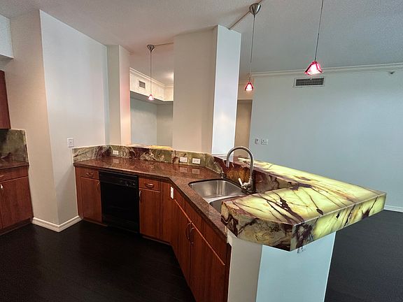 Resort-style poolArched entrywaysRich bamboo flooringGlowing onyx countertopsOpen kitchen