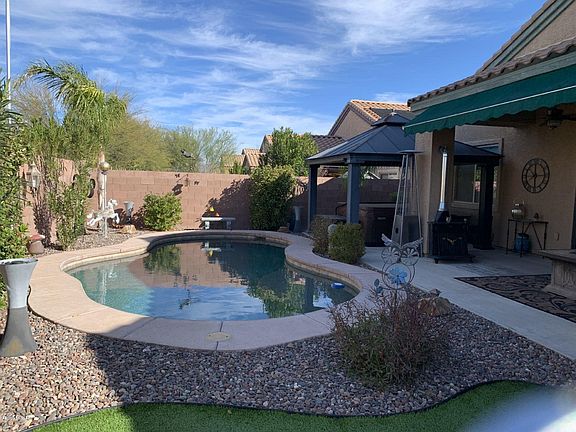 This immaculate home features 10 ft ceilings throughout! Master suite offers a grand master bathroom and generous walk in closet.Oversized family room/bar area is great for entertaining large families.Home boasts a recreational/flex room!Gourmet kitchen has granite countertops, tile backsplash,under cabinet lighting and SS appliances.Large laundry room has space for extra full size refrigerator with water hook up and custom cabinets!Beautiful landscaping in the backyard with a sparkling Pebble-Sheen, solar heated pool w/lagoon and a Bull Frog Spa!Drip irrigation installed on entire property.Gorgeous gazebo and low voltage uplighting add a custom feel to this backyard oasis! Stunning custom steel security screen doors greet you at every entrance! Water softener!Too much to list! A MUST SEE!
