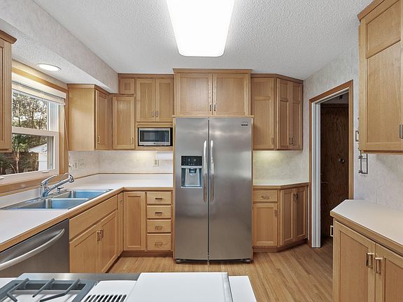 Charming one level living near Rice Lake! Enjoy the open custom kitchen design with all appliances, pullout shelves and work station. The main level includes hardwood floors, three bedrooms on one level, full bath with dual vanity, sunny living room and access to your concrete patio with level fenced backyard! Your lower level features a large open family room with work station/storage closet, large 4th bedroom, bath with dual head shower, huge laundry and storage room with built-in shelves! Utilities include high end water softener, reverse osmosis drinking water system, high efficiency HVAC, heated garage and updated breaker panels. Exterior features architectural shingles, gutters with leaf guards, vinyl maintenance free windows, concrete patio and driveway, 3 car garage with deep stalls, access to the backyard through rear garage door and a huge level backyard! The home is located near shopping, walking trails, schools and easy access to the freeway. Don't miss this gem!