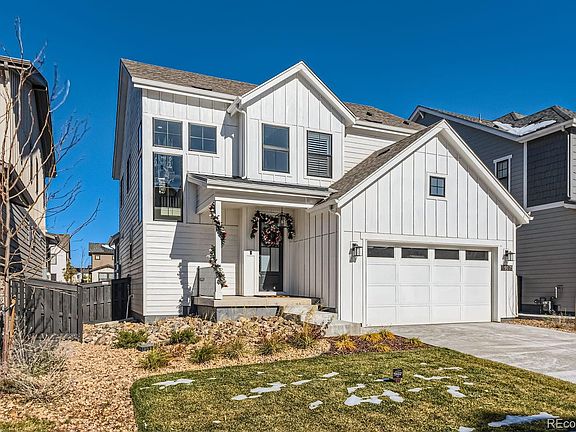 Why wait for new when this gorgeous home is ready NOW?!  This stunning two-story Shea Homes Embark plan in the highly desirable Solstice Community lives like new and features 3 bedrooms, 2.5 baths, loft, spacious gourmet kitchen with large island overlooking the great room, fireplace, covered patio and 2 car garage (plus storage).  Design finishes include luxury plank Shaw Lazio Plus Pecorino flooring, tile floors in the baths and laundry room, MSI Cararra Mist slab quartz kitchen island & counters with full tile backsplash, 6x24 Dekora Panel Cararra White full height tile surround, and Yorktowne Henning Frappe cabinetry. Additional upgrades include genuine cedar wood beams in the kitchen, custom trim work throughout, contemporary lighting, designer wallpaper and custom backyard landscaping. Mesquite shelving, hot tub, fire pit and gas grill are included. Finish the basement for even more living space. Solstice is surrounded by Chatfield State Park on 3 sides of the community and acreage parcels on the 4th side. A $40 per month operations fee is imposed by the Mirabelle Metropolitan District for various services provided to the property. Make this home your own private oasis. Road located behind the home is light residential traffic only – it serves as a pass through.  Don’t miss your opportunity – Welcome Home!