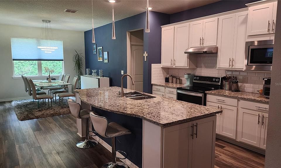 Beautiful Del Webb Stone Creek Community. A wonderful 3/2 home with 3 car tandem garage. Premium, private lot with no neighbors behind you. Insulated concrete block with insulation for added security. Very energy efficient and strong. Home is beautifully updated with granite counters in kitchen and bath. Gorgeous updated 42" cabinets with sliding drawers for easy access to pots and pans. Updated contemporary lighting and fans throughout the home. Updated Luxury Vinyl Plank floors throughout home, except bedrooms. Brand new luxury carpet in Master Bedroom. Three panel sliding stackable glass door that opens to the screened in lanai, for bug free relaxing. It's like adding a whole new room to the home which brings the outdoors in! Brand new luxury carpet in Master Bedroom. Screened in front porch with gorgeous welcoming glass insert in front door. All this in a wonderful active community! Will sell FULLY furnished in SEPARATE sale. Stone Creek has a 24/7 staffed gated entrance, for your peace and security. Luxury amenities include heated indoor and outdoor pools, a state of the art fitness center, hot tubs, sauna and spa. Stone Creeks boasts an onsite staff with activities which include tennis, pickleball, bocce, a softball field, garden and more. We have a beautifully maintained golf course with pro shop, and an on-site restaurant. This home is in a desirable neighborhood, which offers proximity to local amenities and attractions. Don't miss this one.