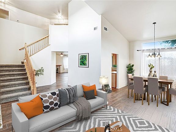 Ceiling fans are installed in all rooms. In addition to the 4 bedrooms and 2 full baths, the upstairs also features a hallway linen closet. Newer flooring, both carpet and tile throughout the entire house. The downstairs windows and sliding glass door look out onto the large covered alumawood patio (with ceiling fan) and a fully landscaped backyard which features mature fruit trees, a koi pond, as well as a gated RV parking area on the side yard. Block wall fencing surrounds the entire landscaped yard. The floorplan is family oriented and the home is located within the prestigious Alta Loma School District. If you're looking for a large family home, this is the one!! Home is virtually stagged.