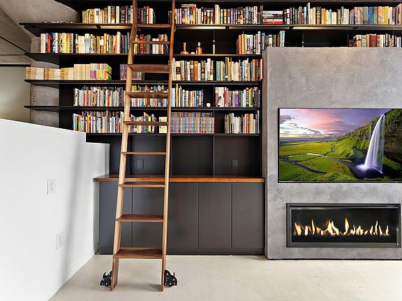 Book lovers and film buffs alike will salivate at the new custom-built library shelving, and electric fireplace/TV wall (2023). Enjoy reaching for a treasured book using the nifty, hand-built rolling library ladder; imagine yourself as Ollivander in Harry Potter reaching for a wand, or the candy store owner in Charlie and the Chocolate Factory tossing sweets to the kids below!
